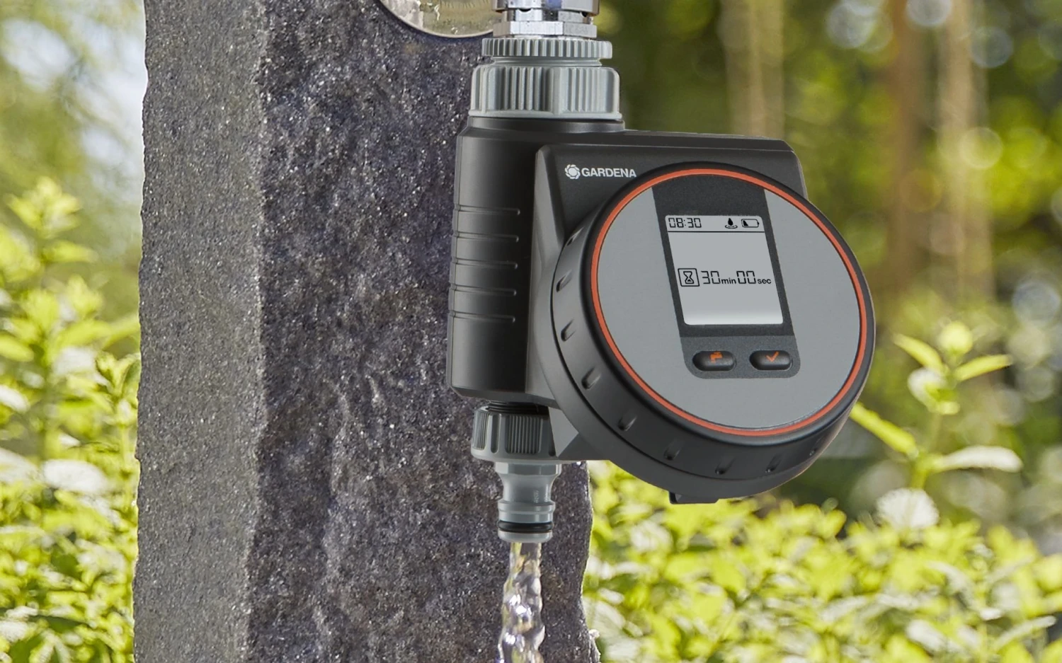 Met de GARDENA besproeiingscomputer Flex kan de irrigatie op balkons, dakterrassen of patio’s flexibel en eenvoudig automatisch worden geregeld. Het apparaat werkt op batterijen, kan direct op de kraan worden aangesloten en kan eenvoudig worden bediend via een innovatieve roterende knop voor de selectie van een programma en het bevestigen ervan. Een gemakkelijk leesbaar display toont alle instellingen in één oogopslag. Het weerbestendige bedieningspaneel kan worden verwijderd. Met de besproeiingscomputer Flex kunnen de besproeiingstijden in cycli van seconden worden aangepast, waardoor ze ideaal zijn voor gebruik met een druppelsysteem. Het is mogelijk om deze waterregeling te combineren met een GARDENA bodemvochtigheidssensor.